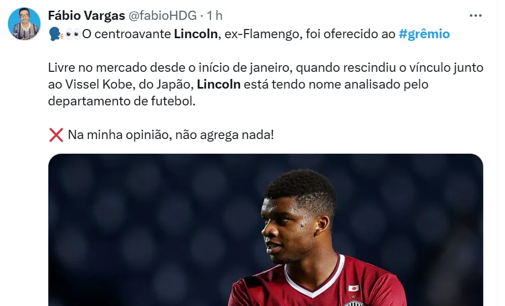 O centroavante de 23 anos está disponível no mercado após rescisão com o Vissel Kobe, do Japão. O nome de Lincoln está sendo analisado pelo departamento de futebol do Grêmio.