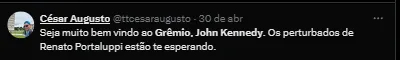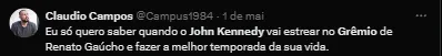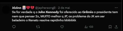 Vários nomes vêm sendo especulados no Imortal e a torcida gremista também sugere alguns. O último nome da vez pedido pelos Tricolores foi o do atacante John Kennedy, que tem uma polêmica no Fluminense.