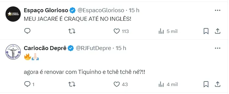 Através das redes sociais, o mandatário não escondeu a empolgação com a permanência do camisa 11 no Botafogo. “Bom dia. Júnior. Você fica tão bem de preto e branco! Você traz um espírito tão bom para nosso vestiário, e estamos muito felizes em recompensá-lo pelo seu incrível compromisso com a nossa família. Estamos juntos!”, escreveu John Textor.