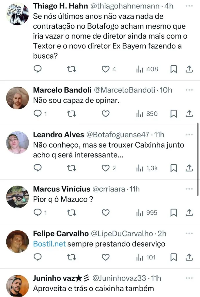 Cerri aparece no momento como nome mais à frente na disputa e também é quem mais agrada internamente no Glorioso. Alexandre Pássaro, ex-Vasco e São Paulo e atualmente na Alliance Global Partners, também está sendo observado pela cúpula do Botafogo.