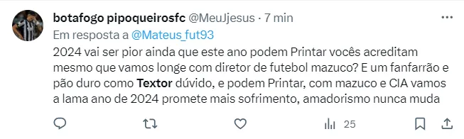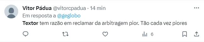 “Cabe a uma associação de árbitros participar de debates nas redes sociais. Humildade e responsabilidade é o que o Brasil espera @abrafutoficial. O STJD já criticou o VAR por cartão vermelho inválido, que prejudicou o Brasileirão. Apenas admita o erro e prometa melhorar”, respondeu Textor no próprio post.