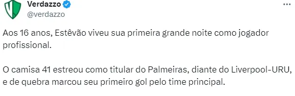 “A primeira grande noite de Estêvão, conhecido como Messinho no mundo do futebol, com a equipe principal do Palmeiras. O talentoso atacante (16 anos) é um dos jovens na agenda do Barça e, na última noite, foi o grande protagonista na vitória contra o Liverpool de Montevidéu (3 a 1) na Libertadores após uma estreia espetacular”, escreveu o veículo.