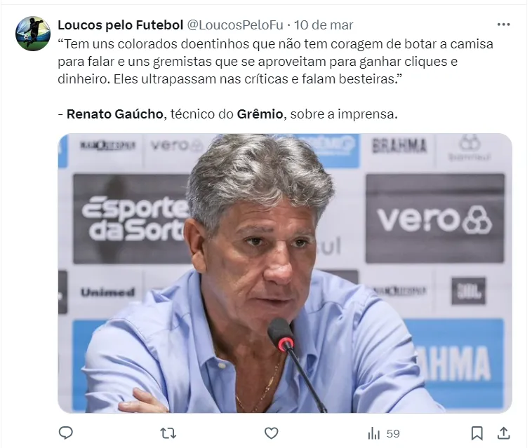 Jornalista critica Grêmio de Renato Gaúcho e mostra fragilidades da equipe: “Sofrendo para conseguir vencer”