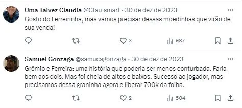 O jornalista foi além e afirmou que agora só depende do Tricolor dos Pampas: “Ontem, eu escutei de uma pessoa importante do clube: ‘está nas mãos do Grêmio, é só o Grêmio dar o aval e aí o negócio acontece’. Há uma expectativa muito grande que isso possa acontecer ainda hoje, é o famoso daqui a pouco, nas próximas horas. Entendo que existe uma grande possibilidade de Ferreirinha vestir a camisa do São Paulo”.