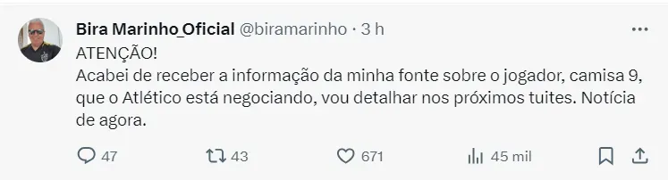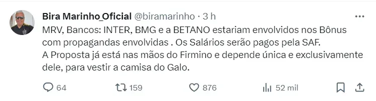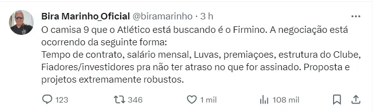 Bira Marinho ainda encerra dizendo que: “A proposta já está nas mãos de Firmino e depende única e exclusivamente dele, para vestir a camisa do Galo”, finalizando a postagem.
