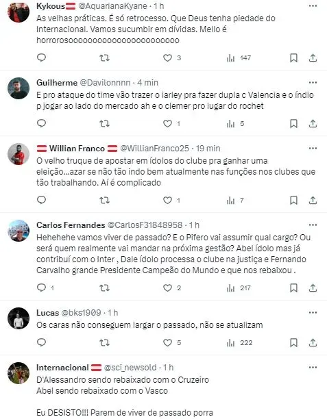 Isso porque o trabalho do argentino no Cruzeiro é criticado e visto com desconfiança por alguns Colorados, pelo fato da equipe mineira estar cravada na zona de rebaixamento, no entanto, boa parte aprova o retorno, já que D’Ale tem grande identificação com o Clube.