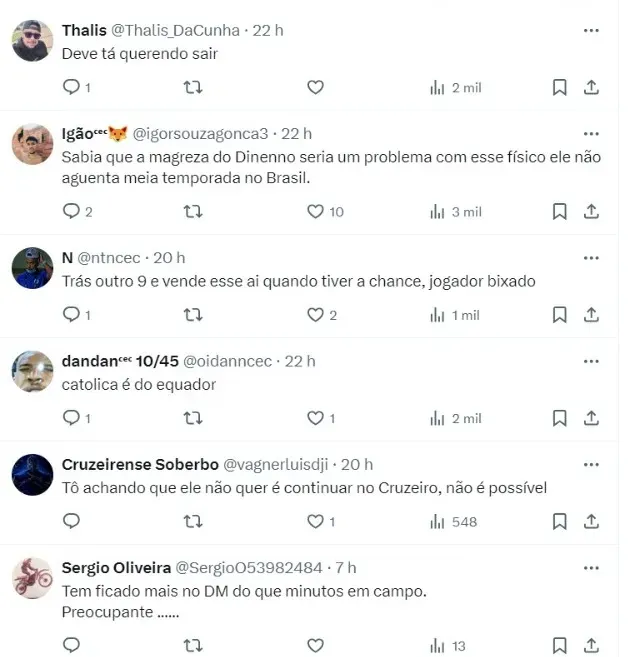 O Departamento de Saúde do Cruzeiro deve nos próximos dias realizar alguns exames para investigar as dores do jogador. Enquanto isso, Dinnemo não tem retorno aos gramados estipulado.