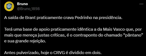 O que muitos falam abertamente até hoje que acabou sendo a última grande manobra política de Eurico Miranda enquanto vivo. E isso evitou que Brant assumisse o Vasco em 2018. Dando lugar ao seu antigo aliado, Alexandre Campello. Que o venceu na votação dos conselheiros.