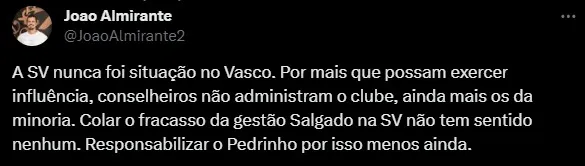 Brant finaliza falando da situação do Vasco da Gama: A gente vive uma situação muito crítica hoje no Vasco. Um ponto é a associação, que não tem um plano de negócios claro, uma fonte de faturamento, não tem uma estratégia de desenvolvimento, com base em algo que faça sentido empresarial. É um desafio colocar a associação de pé. E a SAF é um fator importante nisso. Por pior que seja o plano de negócio da associação hoje, eles têm uma visão parecida, que é uma relação com a SAF. Como será? Há várias possiblidades. Mas não tem outra que não seja com a SAF – concluiu Julio, que ainda citou a gratidão que tem por Pedrinho, que o apoiou nas últimas três eleições.