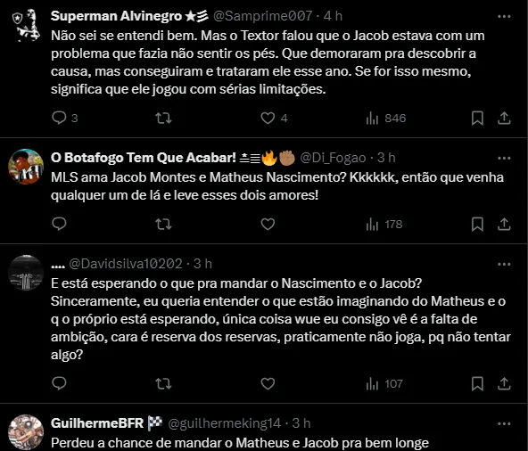“A MLS ama Jacob Montes, a MLS ama Marlon Freitas, a MLS ama Matheus Nascimento, a MLS e todo mundo ama Júnior Santos… A MLS está procurando muito dos nossos jogadores. Alguns de nossos jovens podem se desenvolver lá”, disse Textor, em entrevista ao Botafogo Podcast.