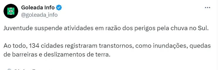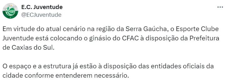 O Juventude teve que suspender as atividades diante das chuvas que castigam no Rio Grande do Sul. Os jogos precisaram ser cancelados por conta dos riscos na região.