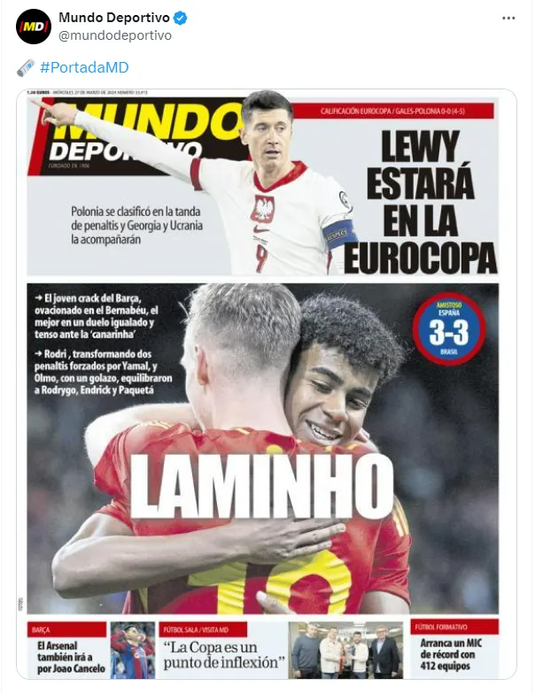 O Barcelona comemorou a atuação de Yamal e provocou o Real Madrid. Os diários Mundo Deportivo e Diario Sport ovacionaram o desempenho do jovem no Bernabéu.