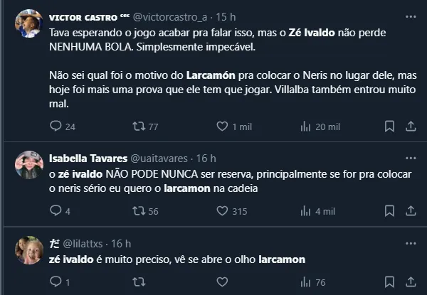 Ele ainda prosseguiu: “É um jogador que acho excepcional, uma qualidade muito grande, mas também é preciso que melhore esse aspecto, porque não foi só uma vez. É preciso ter clareza de que tem que melhorar, e eu sei que ele está trabalhando para isso”, declarou Larcamón.