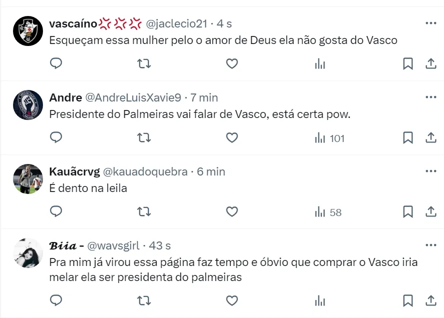 Nesta segunda-feira (27), após reunião no Conselho Técnico do Brasileirão, Leila Pereira disse que ela não vai comprar o Vasco e, além disso, descartou a chance de José Roberto Lamacchia, dono da Crefisa e seu marido, de fechar negócio.
