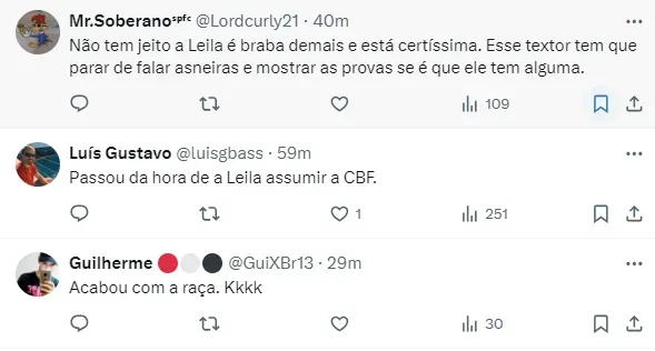 “O John Textor hoje é a grande vergonha do futebol brasileiro. É uma irresponsabilidade ímpar uma pessoa ficar fomentando mentiras. Ele tem que comprovar. Quem quer fazer uma denúncia séria não fica em podcast. Vai no Ministério Público e apresenta suas provas.”, disse Leila em entrevista à CazéTV.