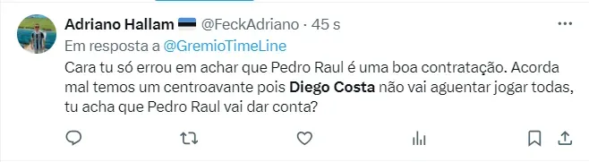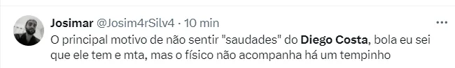 Como se não bastasse a lesão, Diego Costa, junto a Renato Gaúcho e Nathan Fernandes, foi denunciado pelo STJD por conta da confusão do jogo entre Grêmio e Bahia, na Arena Fonte Nova, pelo Brasileiro, em abril.