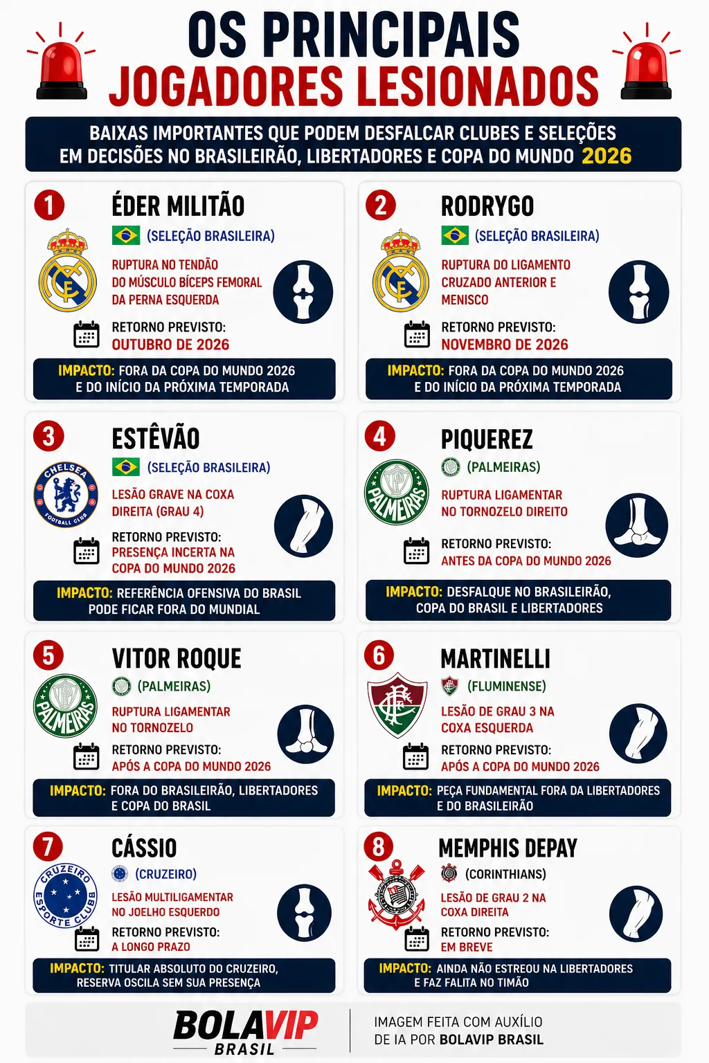 Pensando nisso, listamos jogadores que estão fora ou em dúvida e o que cada ausência representa para seus clubes ou seleções. Além disso, destacamos o impacto dessas baixas no desempenho das equipes, seja na Libertadores, no Brasileirão ou na Copa do Mundo.