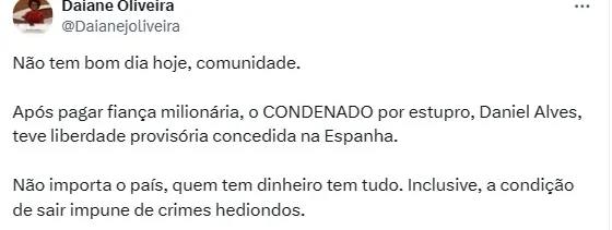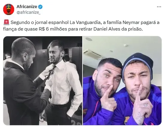 “Não sei se é mais absurdo o pai do Neymar pagar para o Daniel Alves sair da cadeia ou se é a justiça espanhola conceder a liberdade provisória para ele“, disse uma pessoa.