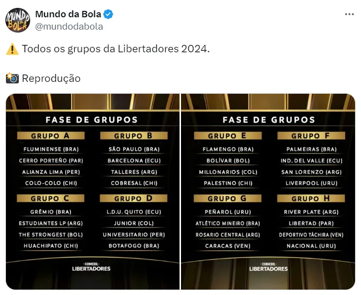 - 4ª rodada – 08/05, às 21h30: Botafogo x LDU – Transmissão: Globo e ESPN/Star+