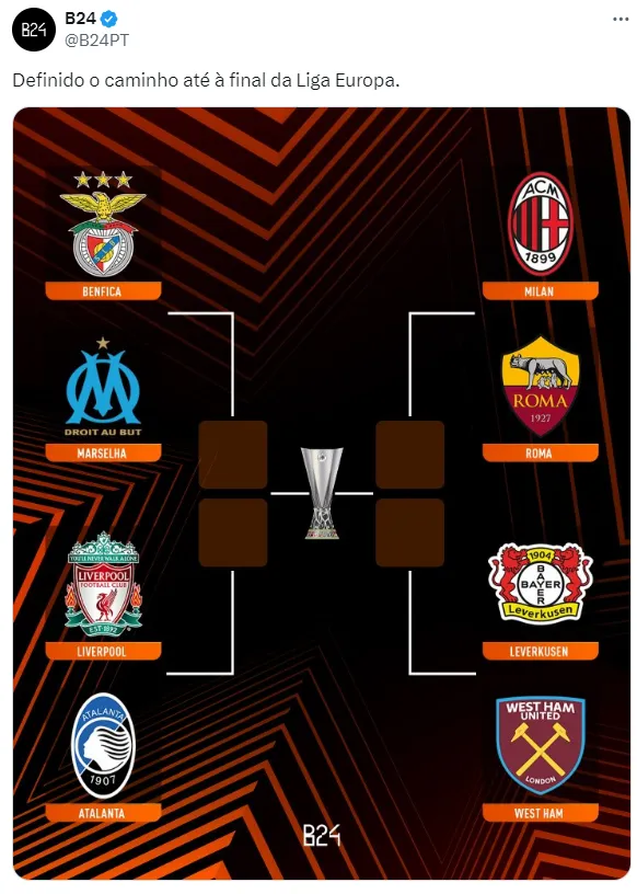 Do outro lado, o vencedor do clássico entre Milan e Roma terá que encarar o vencedor do duelo entre Bayer Leverkusen e West Ham. Outro finalista sairá desta chave.