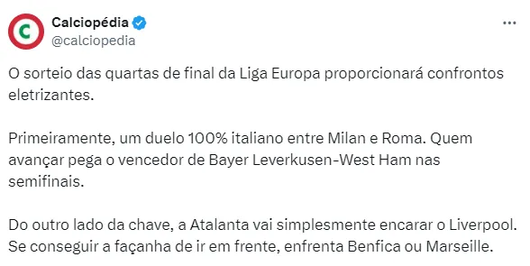 O clássico entre Milan, que corre o risco de ser punido pela Uefa, e Roma foi um dos principais destaques do sorteio. Além disso, Liverpool e Bayer Leverkusen, considerados os favoritos, podem se enfrentar apenas na final.