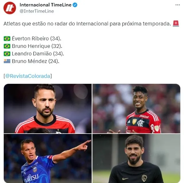 De acordo com informações da Revista Colorada, o Internacional tem interesse na contratação de quatro jogadores, são eles: Éverton Ribeiro, Bruno Méndez, Leandro Damião e Bruno Henrique. Os três jogadores que atuam no futebol brasileiro, também já tiveram sondagens do Grêmio para 2024.