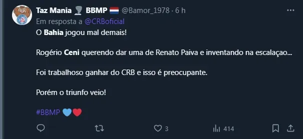 Entretanto, apesar do resultado positivo ter saído graças ao gol solitário de Thaciano, já nos acréscimos da primeira etapa, o resultado foi a única coisa que agradou o técnico Rogério Ceni.