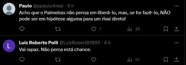 Além disso, está fora de cogitação o Palmeiras reforçar time rival, especialmente o Grêmio que também disputará a Libertadores. O jogador é querido pelo staff do Palmeiras e também pela comissão técnica.