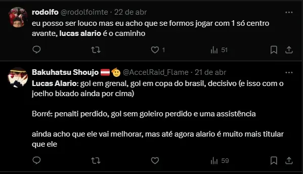 Além de Lucas Alario, o Internacional possui mais três centroavantes à disposição para a temporada de 2024: Enner Valencia, Lucca e Rafael Borré. Nas rodadas iniciais do Brasileirão Série A, o colombiano foi o escolhido pelo treinador.