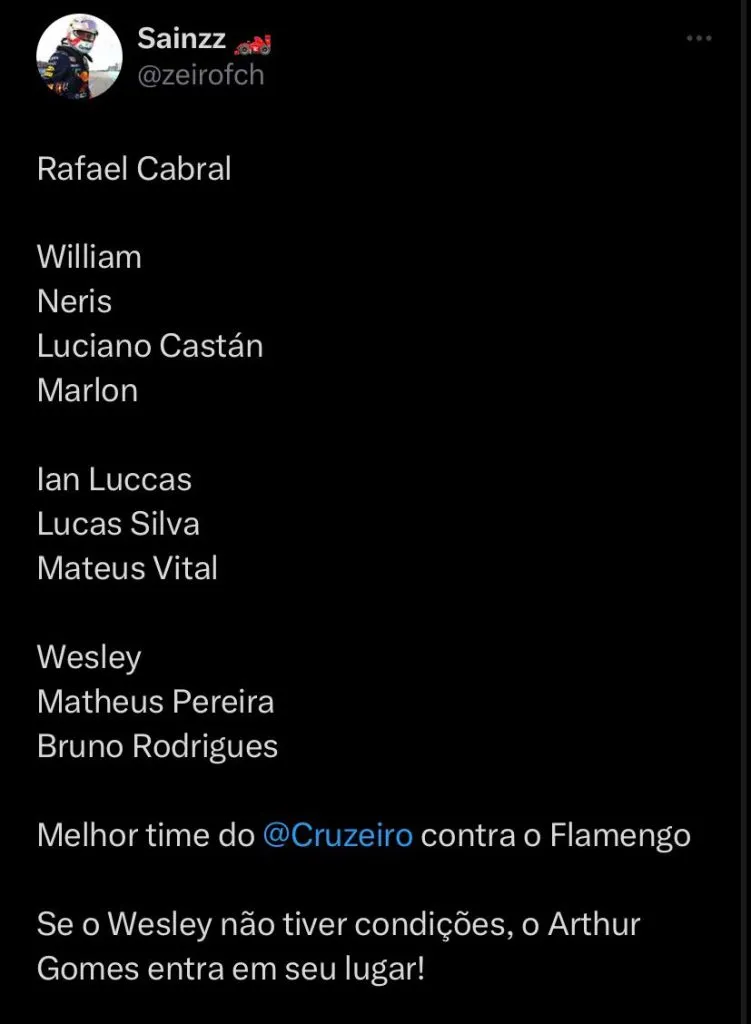 No último sábado (14), o Cruzeiro empatou com o Cuiabá fora de casa em 0 a 0, em partida válida pela 26ª rodada da Série A do Campeonato Brasileiro. Para o confronto da próxima quinta-feira (19), contra o Flamengo, às 19h (de Brasília), no Mineirão, em confronto válido pela 27ª rodada do Brasileirão, o Cabuloso terá desfalques.