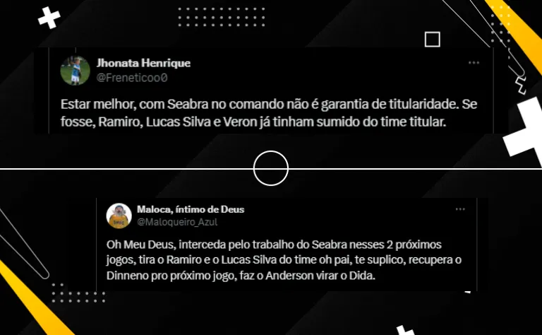 Por outro lado, a dupla vem sendo muito contestada. A torcida celeste está na bronca com as últimas atuações dos dois. Apesar de serem contestados, eles seguem blindados e com mortal com o treinador Fernando Seabra, que também é contestado, mas segue garantido no comando técnico.