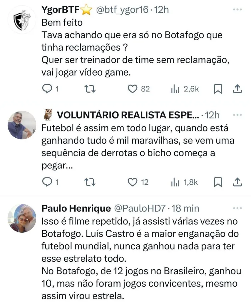 “Bem feito. Tava achando que era só no Botafogo que tinha reclamações ? Quer ser treinador de time sem reclamação, vai jogar vídeo game”, tirou onda outro membro da torcida do Fogão.