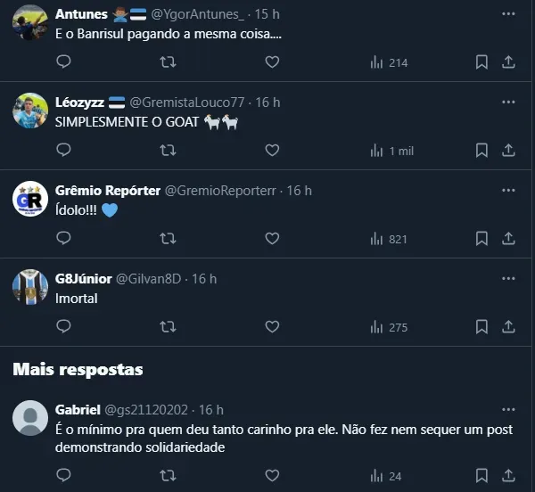 Não à toa, apesar de não ter cumprido o restante do contrato, o torcedor gremista também idolatra o grande atacante. Vale frisar que o Tricolor teve seu jogo adiado e só deve voltar a campo na próxima semana.