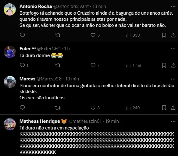 Com a pedida alta, Textor e cia recuaram na negociação e William deve permanecer no Cruzeiro para a disputa do Mineiro, Copa do Brasil, Série A e da Copa Sul-Americana de 2024. No entanto, o Botafogo pode retomar o papo.
