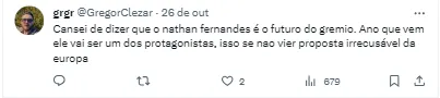 O Grêmio conseguiu um resultado muito importante na última quarta-feira (25), diante do Flamengo, na Arena, ao vencer pelo placar de 3 a 2, de virada. É verdade que o time não subiu tanto na tabela de classificação, mas com o resultado, a equipe comandada pelo técnico Renato Portaluppi diminuiu para três pontos do último dentro do G-4, justamente o Flamengo. E o resultado que animou o elenco, foi especial para Nathan Fernandes, autor de um dos gols.