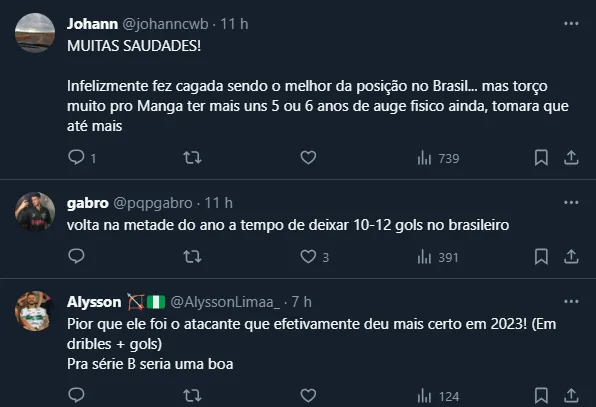 Vale destacar que Alef Manga está com 29 anos e seu contrato com o Coritiba vai até dezembro de 2025. Isto é, para cumprí-lo até o fim, Manga terá que se provar dentro das quatro linhas quando puder voltar.