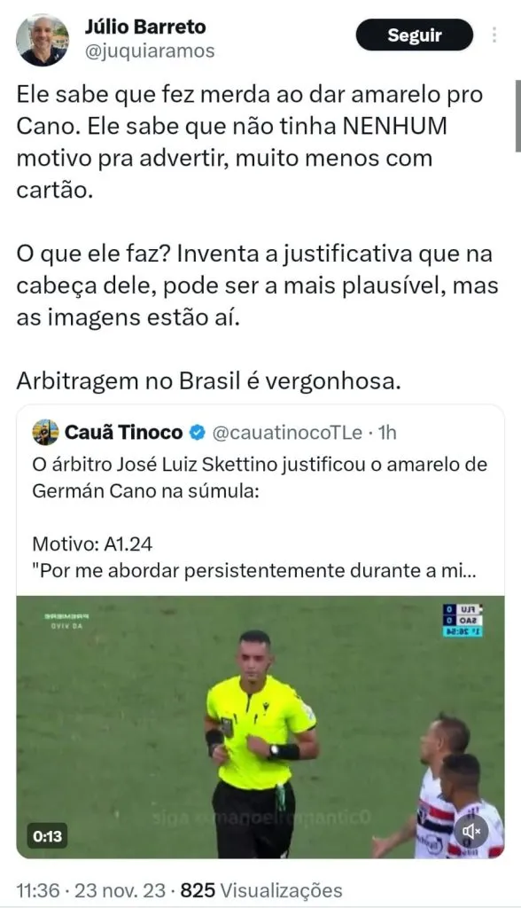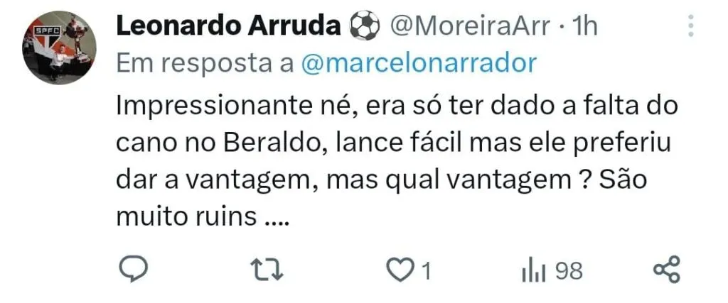 “Não entendi muito, o jogo não valia rigorosamente nada para nenhum dos dois, era para ser um amistoso, nem Fluminense nem São Paulo tem mais nada que fazer no Brasileiro. Já se livraram do risco de rebaixamento, já estão na fase de grupos da Libertadores graças aos títulos da Copa do Brasil e da Libertadores, então não entendi aquela carnificina.”, criticou o jornalista durante o podcast UOL News Esporte.