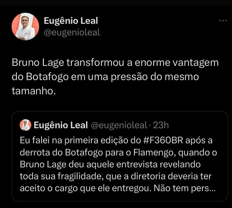 “Eu falei na primeira edição do F360 após a derrota do Botafogo para o Flamengo, quando o Bruno Lage deu aquele entrevista revelando toda sua fragilidade, que a diretoria deveria ter aceito o cargo que ele entregou. Não tem personalidade para liderar o grupo rumo ao título”, disse. “Bruno Lage transformou a enorme vantagem do Botafogo em uma pressão do mesmo tamanho”, completou o jornalista.