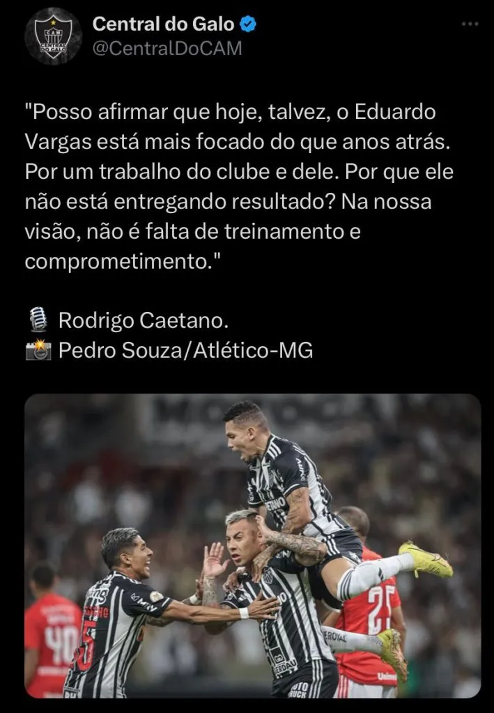 Rodrigo ainda ressaltou os minutos do atacante em campo. “Não é falta de treinamento, comprometimento, nem conduta profissional. A minutagem dele é baixa”, comentou. Caetano ainda disse que o chileno foi decisivo no ano passado. “No ano passado, na reta final, foi um dos jogadores mais decisivos na lesão do Hulk. Renovamos o contrato dele por mais um ano (2024). Em 2023, ele teve menos minutagem, penso eu, também, pela liga que se criou entre Hulk e Paulinho. A minutagem dele é baixa, difícil de julgar”, completou o executivo.