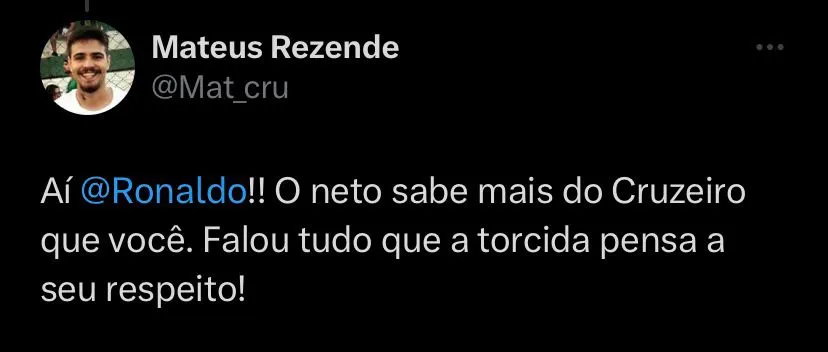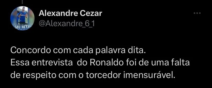 A atual situação do Cruzeiro na Série A do Campeonato Brasileiro não é boa, o Cabuloso perdeu para o Flamengo na última quinta-feira (19), por 2 a 0, no Mineirão e agora está com um ponto de diferença para o Santos, que é o primeiro time na zona de rebaixamento. Ronaldo tem vivido um momento de “desconfiança”, como ele próprio descreveu, com a torcida do Cruzeiro. Exaltado no momento que assumiu a gestão do futebol do clube mineiro e porque melhorou a situação financeira do clube, além de recolocá-lo na elite do Brasileiro.