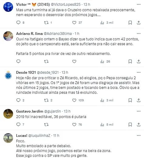 O treinador apontou pontos que valorizam o avanço do time e utilizou o rival como parâmetro: “O Cruzeiro está fazendo as coisas certas, e cada passo é uma conquista, precisamos valorizar o esforço. Hoje o Atlético Mineiro foi a Bragança e venceu o Bragantino, então vimos o tamanho da nossa vitória contra eles no domingo. Isso valoriza. Exorcizamos essa questão do Mineirão, que também era importante”, afirmou Zé Ricardo.