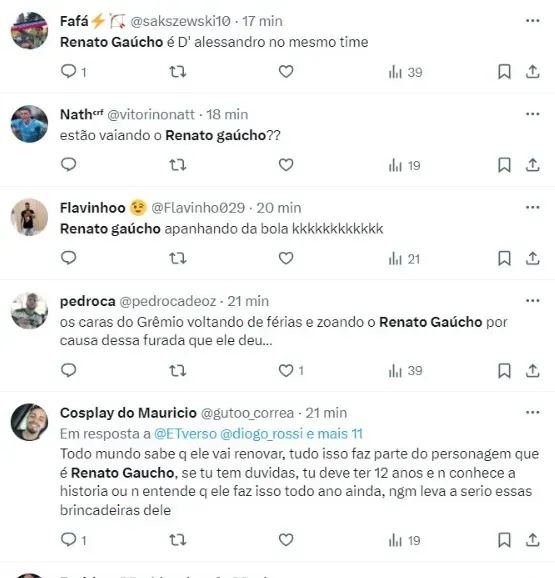“Renovar ainda não está renovado, mas está bem encaminhado, espero ficar lá mais uma temporada. Não sei… Não renovei ainda”, complementou Renato Gaúcho.