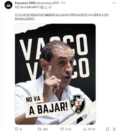 O CEO ainda agradeceu a Ramón Díaz e aos jogadores por terem salvado o Clube: “”Gostaria de agradecer ao departamento de futebol, à comissão técnica e a todos os atletas. Eles foram capazes de virar um jogo que estava muito complicado. Em todas as vezes o clima foi de confiança, eu vi, conversando com todos, que a gente vai chegar lá. Como disse Ramón, o Vasco não caiu”, finalizou.