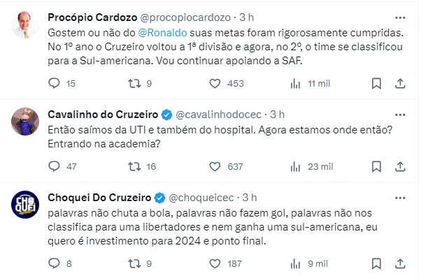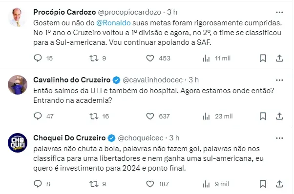Ronaldo também pediu a confiança dos torcedores para a continuação do trabalho, que não é fácil, mas que o Cruzeiro segue no caminho certo. O dirigente ainda garantiu que 2024 será um ano melhor e mais audacioso