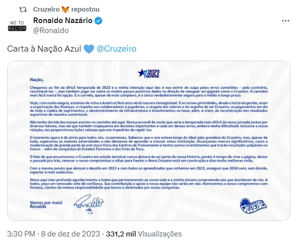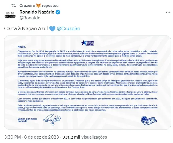 O Ronaldo publicou nesta sexta-feira (8), uma carta aberta para os torcedores do Cruzeiro, retratando sobre a temporada de 2023. O ex-jogador admitiu os erros cometidos, mas acabou valorizando a vaga para a Sul-Americana.