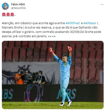 Segundo informações do colega Fábio HDG, sem espaço no Al-Ittihad, ele já pode assinar um pré-contrato em janeiro. “Atenção, em clássico que acontece agora entre Al Ittihad e Al Nassr ( Marcelo Grohe ) é outra vez reserva. O que se diz é que Galhardo não deseja utilizar o goleiro. Com contrato acabando 30/06/24, Grohe pode assinar pré-contrato em janeiro”.
