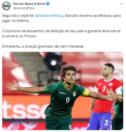 O experiente centroavante boliviano Marcelo Moreno teria se oferecido para se tornar reforço do Grêmio nesta janela de transferências. A informação foi confirmada pelos jornalistas Matheus D’Ávila e João Batista Filho.