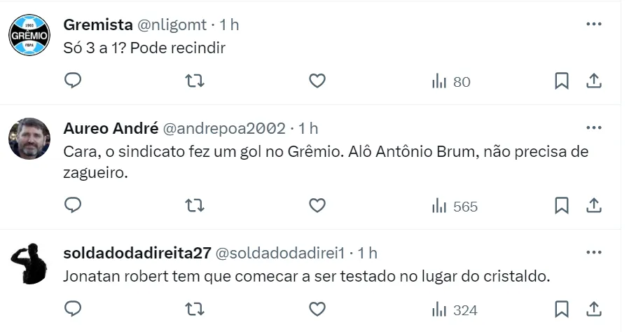 Apesar da derrota em sua primeira partida no Clube Gaúcho, o atacante venezuelano foi elogiado na web pelos gremistas por sua atuação contra o Caxias e foi um dos poucos que se salvou das críticas.
