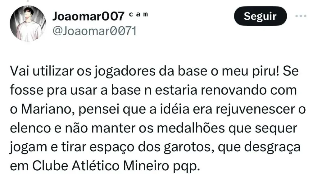 Além de ter a espinha dorsal montada, o Atlético Mineiro quer em 2024 aproveitar mais os meninos da base e colocá-los para jogar. Ou seja, cada setor terá pelo menos um garoto que terá chance ao longo do ano.