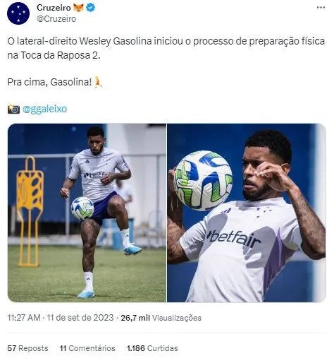 Isso porque o lateral-direito Wesley Gasolina foi liberado pelo departamento médico para iniciara uma nova etapa em sua recuperação. Nesta segunda-feira (11), Wesley iniciou as atividades de preparação física, após sete meses se recuperando de uma lesão no joelho direito.